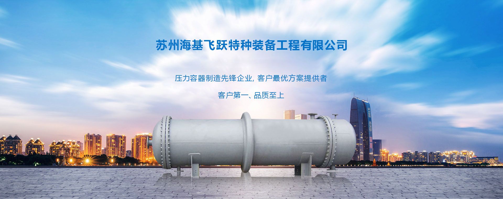 ABOUT US苏州海基飞跃特种装备工程有限公司座落于美丽的阳澄湖畔,离最近高速口仅1公里,交通便利,周边配套设施齐全。公司创建于1979年,是从事开发、设计压力容器等特种设备专业制造厂家。目前公司具有A2级压力容器设计、制造许可证,美国ASME“U”钢印授权证书,通过ISO9001质量管理体系认证、ISO14001环境管理体系认证及ISO45001职业健康安全管理体系认证,是北化学生的实习基地。